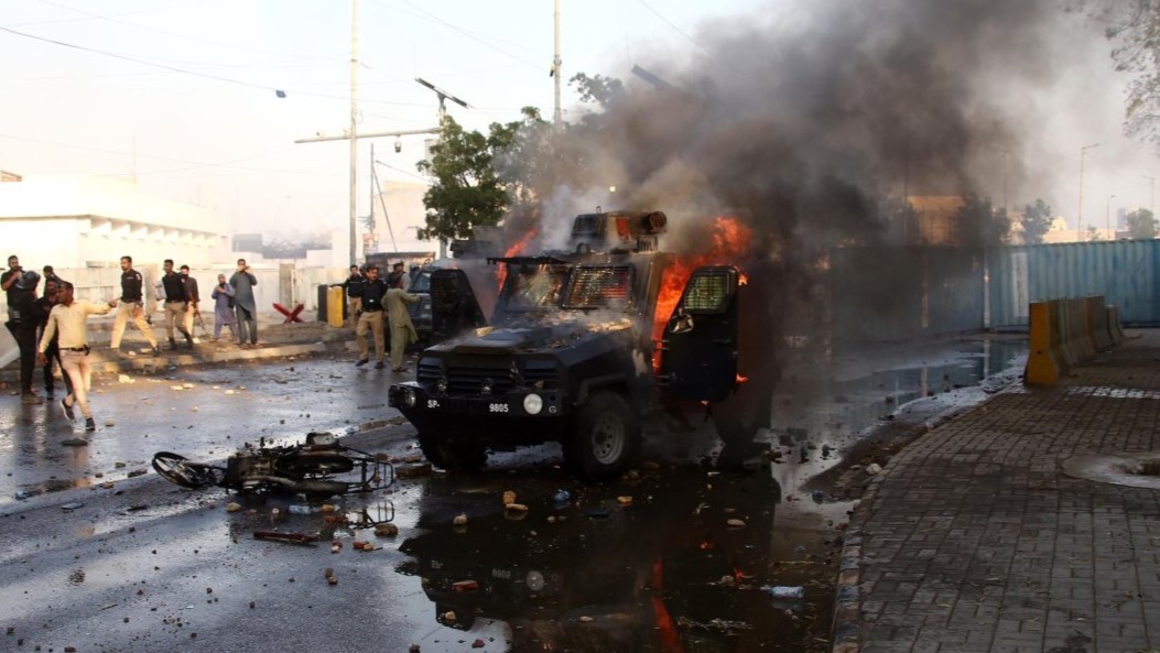 পাকিস্তানের করাচিতে নিরাপত্তা বাহিনীর সাথে বিক্ষোভকারীদের সংঘর্ষের সময় পুড়িয়ে দেয়া পুলিশের গাড়ি,  ১ মার্চ, ২০২৬। ছবি: সংগৃহীত