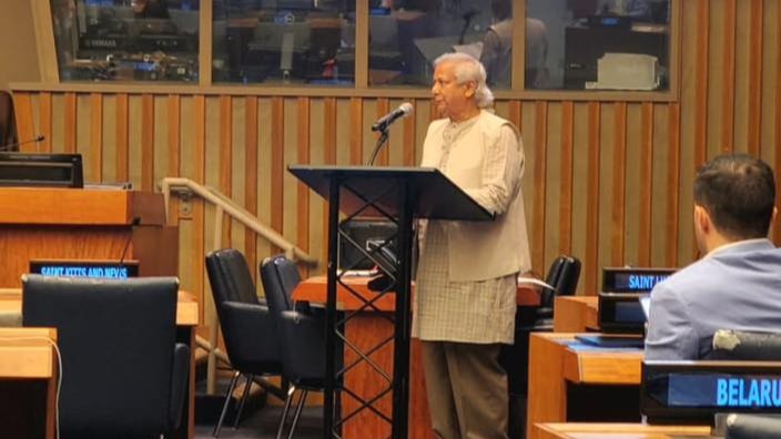 প্রধান উপদেষ্টা অধ্যাপক ড. মুহাম্মদ ইউনূস নিউইয়র্কে ‘যুবদের জন্য বিশ্ব কর্মসূচি’র ৩০তম বার্ষিকী উপলক্ষে জাতিসংঘ সাধারণ পরিষদের অধিবেশনের সাইডলাইনে বিভিন্ন দেশের নেতাদের উদ্দেশ্যে বক্তব্য দেন। ছবি: প্রধান উপদেষ্টার ফেসবুক